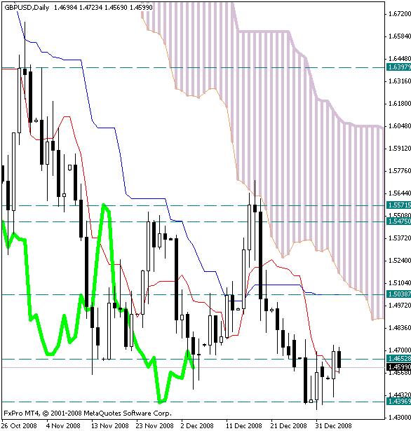 В ходе торгов в понедельник 5 января можно было наблюдать краткосрочное коррекционное движение, которое в данный момент замедлилось возле уровня сопротивления 1.4650/1.4700. В ближайшее время нельзя исключать возобновление нисходящего движения и повторное тестирование уровня поддержки 1.4400